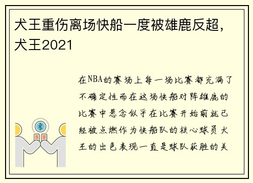 在NBA的赛场上,每一场比赛都充满了不确定性,而在这场快船对阵雄鹿的比赛中,悬念似乎在比赛开始前就已经被点燃。作为快船队的核心球员,犬王的出色表现一直是球队获胜的关键。就在比赛进行到关键时刻时,犬王突然因伤离场,这一突发事件让整个比赛的局势发生了翻天覆地的变化。