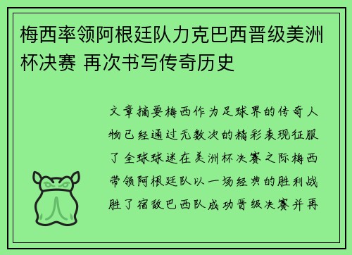 文章摘要:梅西,作为足球界的传奇人物,已经通过无数次的精彩表现,征服了全球球迷。在美洲杯决赛之际,梅西带领阿根廷队以一场经典的胜利战胜了宿敌巴西队,成功晋级决赛,并再次书写了个人和阿根廷足球的传奇历史...