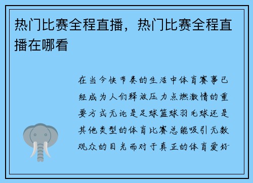 在当今快节奏的生活中,体育赛事已经成为人们释放压力、点燃激情的重要方式。无论是足球、篮球、羽毛球还是其他类型的体育比赛,总能吸引无数观众的目光。而对于真正的体育爱好者来说,能够第一时间观看比赛的直播,...